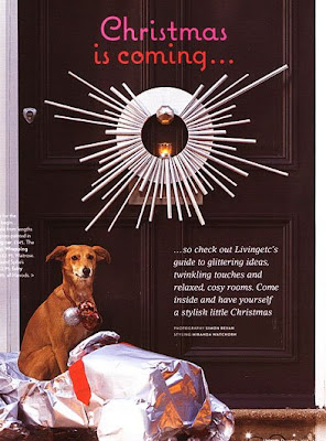 So as I mentioned, I’ve decided that this year I’m going to make myself a wreath- but I want it to go with the theme I started last year with my tree, and to keep it modern. I’ve been looking at a bunch of options out there- and still haven’t come to a decision- The latest December 08 Living Etc. has some interesting ideas. First, I like the retro starburst concept- I’d probably do it in gold, to match the starbursts in my tree- but I’d probably do the rays in smaller proportions. It does make quite a statement on your door though doesn’t it?