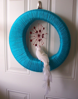 OOH! i’m getting closer to a solution!!! I’m in LOVE with this amazing wreath idea from the fabulous Mid Century Modern Utah blog that Laure posted over at AT:LA– I love the idea of wrapping the yarn because I had wrapped styrofoam balls for my tree. I still have leftover yarn from that- oooh… great inspiration… getting ideas…