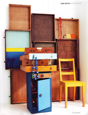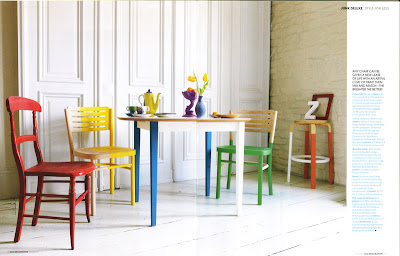 Ever since I saw this chair, I’ve been obsessed with furniture that is masked off and painted (remember the spray paint bandits?)- The supplement to the May 2009 issue of Elle Decoration has this incredible editorial piece called “Junk Deluxe”, with styling by Rebecca McEvoy and photos by Damian Russel. Rebecca was given £200 and a paintbrush and sent on a mission to revamp some furniture from local thrift shops. The results are so inspiring.