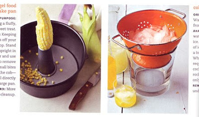 Three of my favorite ideas: 1) using an angel food cake pan to hold the cob when you remove the kernels with a knife- 2) using a colander on top of a bowl, bucket, or vase to drain the water from melting ice (love the look of the clear vase underneath)- ,
