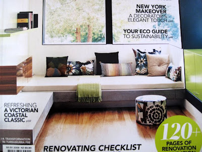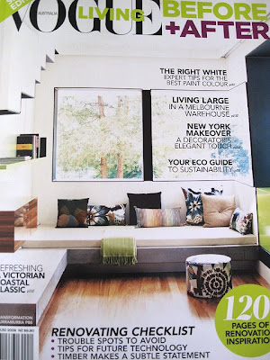 Beautiful cover of the “special edition” of Australia Vogue Living “Before and After”- autumn/winter 2009- Love the dark tones in the pillows (Missoni home?) that are offset by the light colored walls and concrete base of the seating area.