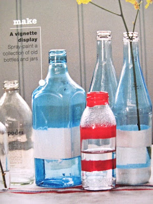 I’m such a sucker for simple displays of glass bottles and vases. Saw this really easy and fun summery idea in the September 09 issue of Australian Real Living mag. Use some masking tape and spray paint some stripes on them! I love the imperfection and oversprays too-