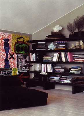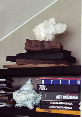 Spotted this in a recent Italian issue of Marie Claire Maison. Totally drawn to the bookcase, and the little vignette of the stacked wood panels with the white sculpture/rock? thing on top.