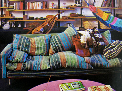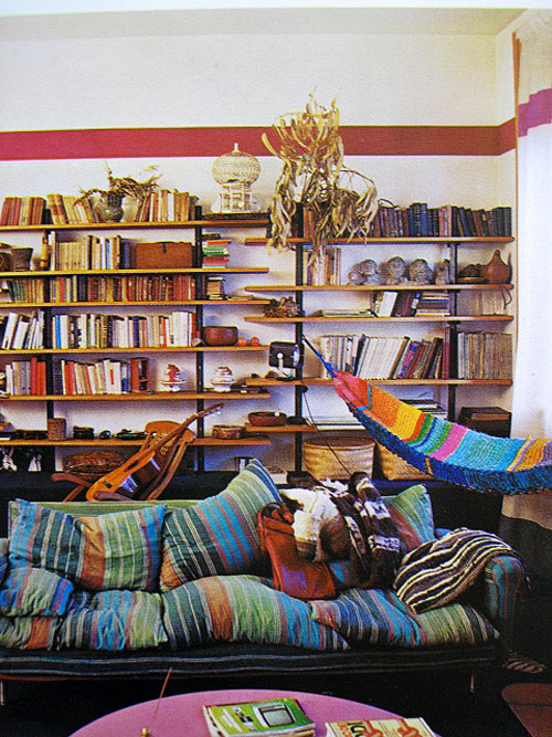 So much to love about this room!! The caption reads: “A colourful living-room decorated both simply and spontaneously. The hand-designed tapestries, cushions and curtains are all by the designer himself. Architect Egle Amaldi.” (much more after the jump…)