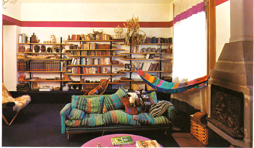 I love how he carried the stripe to line up from the curtain onto the wall- also there’s an accent of color on the bottom of the curtain too. Just a great cozy and colorful space that I would have loved to hang out in. I can’t find much more info about the architect, but if you ever come across this book- DEFINITELY get it!