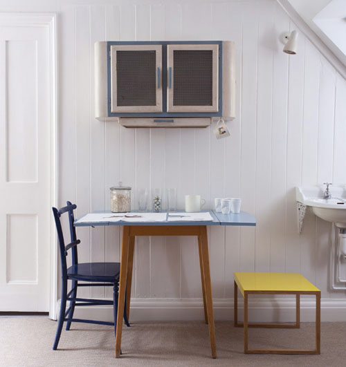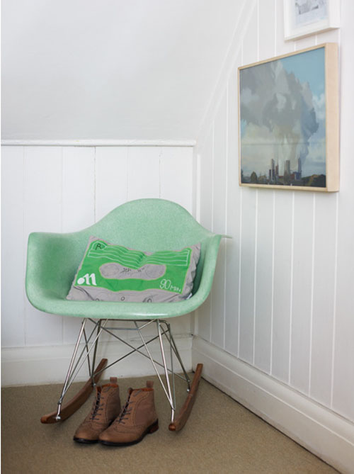 I love this little eating nook of Lizzie Evans, owner of the Smug shop. So charming, and love the tonal blues against the white with the little modern hit of yellow. Also love this corner with an Eames rocker (after the jump)…