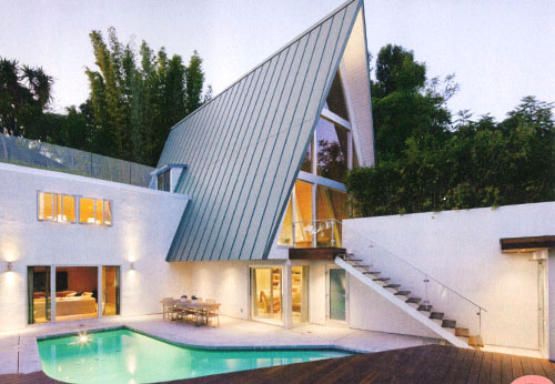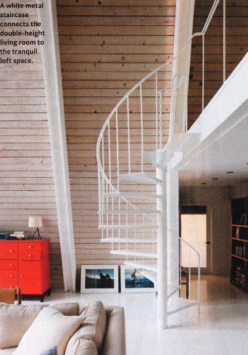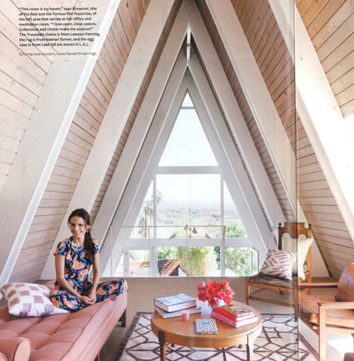 Slightly obsessing over the incredible A-frame image of Jordana Brewster’s home featured in the May 2011 InStyle magazine. I LOVE the pale wood panels and the exposed white rafters. Also hard to see in the pic, but there’s a metal hanging arm lamp in the center. Amazing.