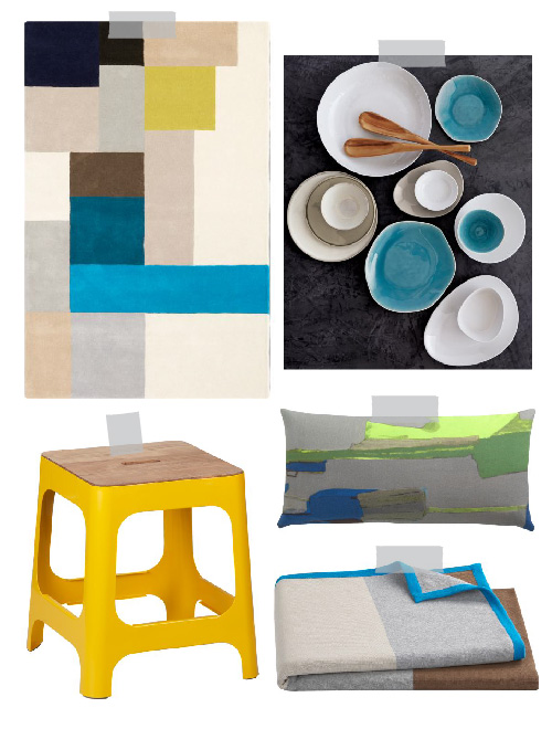 Oh so many pretty things in the new CB2 catalog. Love the happy colors. They’re making this back-to-work tuesday a little easier… (at least on the eyes!) Clockwise from top left: pixel rug, naxos dinnerware, scape pillow, broad stripe throw, hitch marigold stool