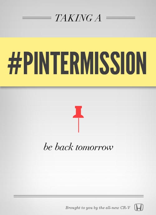 Pinterest basically acts as sort of a visual way of making that type of “list”- you pin things you want to do, or make, or dream of, get inspired by, etc… So Honda challenged me, along with a few other Pinners, to have a “Pintermission.” Take a full day off from “pinning” on the computer (yes, hands up and step away) and go out and do something/anything that I’ve pinned. The best part is, they are willing to sponsor it by giving me $500.
