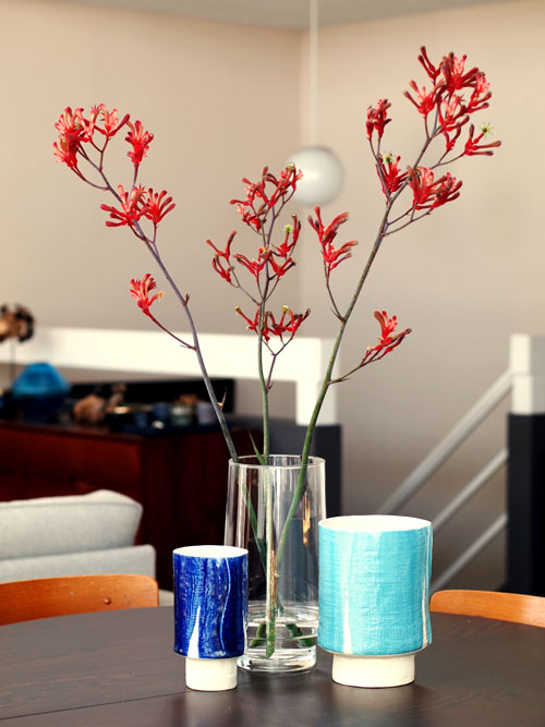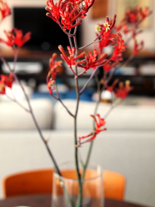 I definitely would not consider my self a “flower” type of guy, but I have to admit that nothing livens up a place like some fresh foilage. Last week I knew I was going to have a bunch of lovely blog buddies over, so I picked up some of these deep red “kangaroo paws“. I wanted something with some height, but didn’t really feel like tree branches were very “summer-y”- I think these guys worked out nicely. I love their minimal form, weird sculptural tips, and pop of color. It also gave me an excuse to display my happy new vases from West Elm designed by Elephant Ceramics!