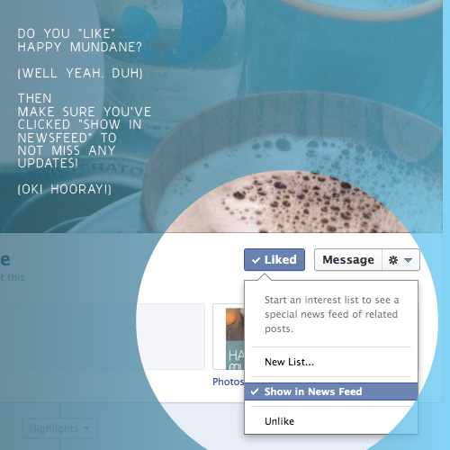 First, I wanted to thank all of you that have “liked” the Happy Mundane facebook page (to the right). Unfortunately, Facebook recently changed their policy on Pages and many of you might not be receiving updates as a result. However, you can easily keep up with our little mundane musings by clicking on the “Show in News Feed” under the “Liked” box on the Happy Mundane page once you’re in Facebook. So, if you’ve noticed you’re not receiving updates, just double check you have the “Show in feed” clicked. Thanks so much for taking time out of your day to hang with me here. And don’t forget I’m also posting musings on instagram and twitter (@happymundane). Thanks again for all your support!
