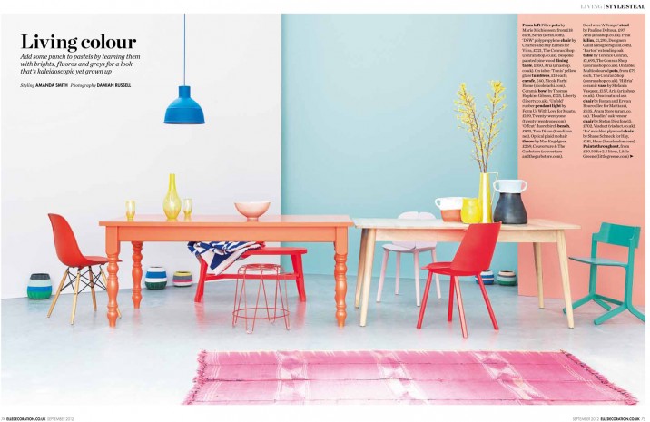Soft pastels get paired with a punch of fluorescence! This awesome editorial is totally inspired. Styling by Amanda Smith and photographed by Damian Russel for the September 2012 issue of Elle Decoration UK.