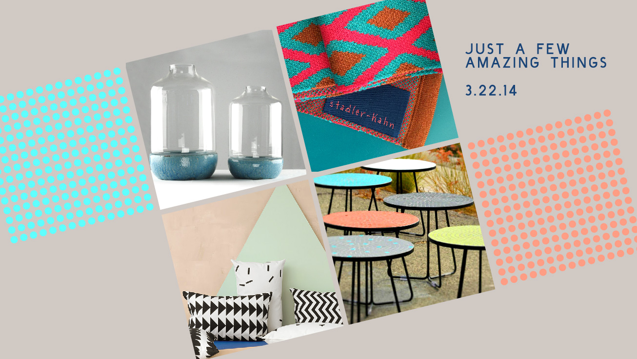 3) Now I realize not all places are quite in full spring bloom, so for those that are still experiencing some colder weather, here’s some bright and fun scarves from this fun new shop, Stadler-Kahn. Started by Alex Stadler, the shop houses a wonderful and quirky selection of textiles, home goods and accessories. Here’s a little video about the shop: